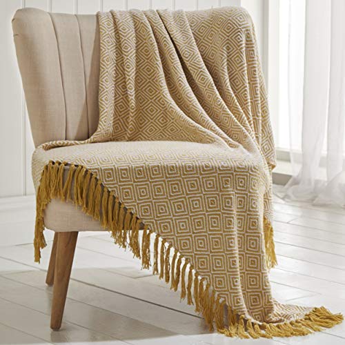Portfolio Throw Blanket with Geometric Pattern Ochre ~ Portfolio Throw Blanket with Geometric Pattern Ochre Yellow 130 x 170 cm Luxury Two Tone 100 Cotton Throw Ascot This is a variation listing products can be selected as required from drop down box This luxury Two Tone 100 cotton tassel throw gives a decorative style to your home or can be used at a picnic Material is 100