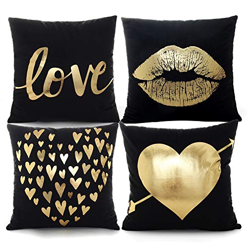 YNester 4 Pcs Flannel Gold Pillow Covers Decorative Gold ~ YNester 4 Pcs Flannel Gold Pillow Covers Decorative Gold Love Lips Throw Pillow cases Cushion Covers pillowcover 45 x 45 cm Cushion Cover Bronzing for Couch Bed Sofa GIFT Black flannel bronzing