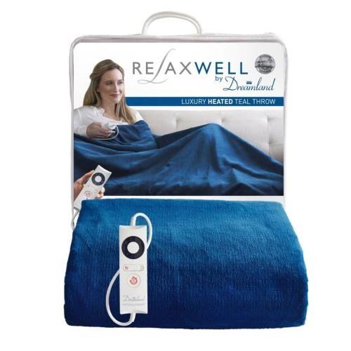 Relaxwell by Dreamland Intelliheat Heated Throw Teal 120 ~ Relaxwell by Dreamland Intelliheat Heated Throw Teal 120 x 160cm A lovely snuggly layer to wrap around you on the sofa this generously sized luxury Dreamland Velvety Heated Throw in an attractive shade of teal blue heats up quickly to keep you warm and cosy on a winter’s evening yet it costs as little as a penny to run for as long as 7 hours